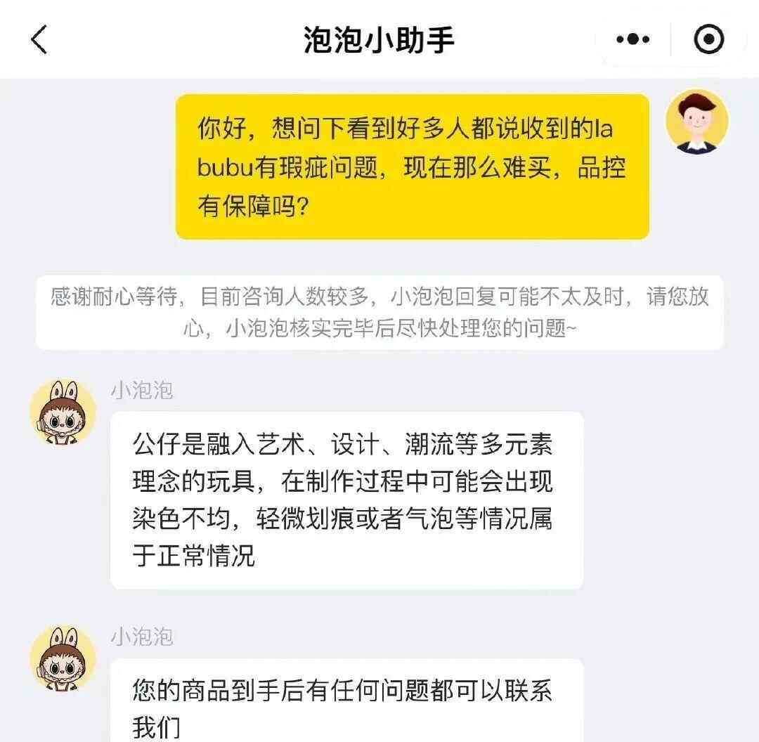 泡泡玛特在线客服表示,公仔是融入艺术、设计、潮流等多元素理念的玩具,在制作过程中可能会出现染色不均,轻微划痕或者气泡等情况属于正常情况,如果商品有瑕疵,可以申请售后服务。客服表示,商品出场时都会经过严格的质检审核,消费者可以放心购买。