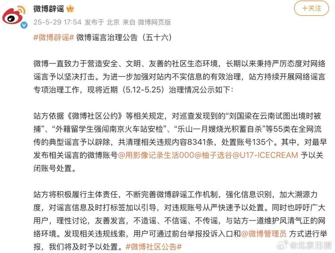 站方依据《微博社区公约》等相关规定,对巡查发现到的“刘国梁在云南试图出境时被捕”“外籍留学生强闯南京火车站安检”“乐山一月嫂烧光积蓄自杀”等55类在全网流传的典型谣言予以辟除,共清理相关违规内容8341条,处置账号135个。其中,对最早发布相关谣言的微博账号@用影像记录生活000@柚子选谷@U17-ICECREAM 予以关闭账号处置。
