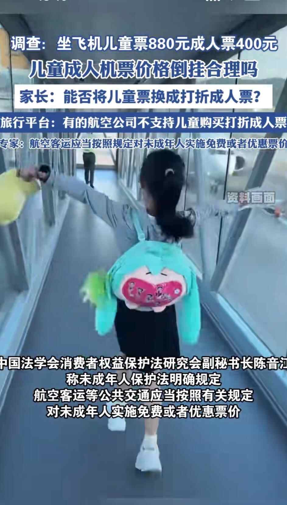 按理说孩子可以享受购票优惠,怎么坐飞机比大人还贵?据报道,这与儿童票价的算法有关。儿童票价固定按照全价机票的50%计算,而成人票价可以打折,常有波动。一旦成人机票折扣低于5折,儿童票价就会“尴尬”地超过成人票价。近年来,航司间竞争激烈,机票打折力度较大,导致儿童票价高于成人折扣票的现象频频出现。