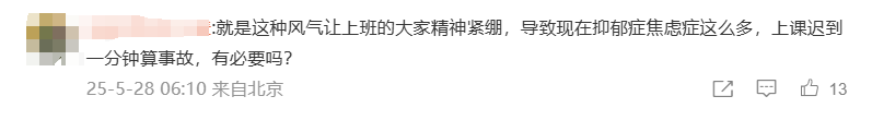 还有网友表示,这种风气让上班的大家精神紧绷,导致现在抑郁症焦虑症这么多,上课迟到一分钟算事故没有必要。