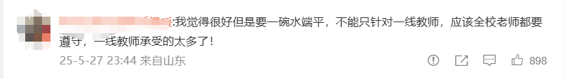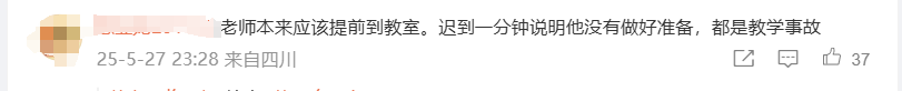 对此,有网友表示老师本来应该提前到教室,迟到一分钟说明他没有做好准备,都是教学事故。也有网友觉得处理很好但是要一碗水端平,不能只针对一线教师,应该全校老师都要遵守,一线教师承受的太多了。