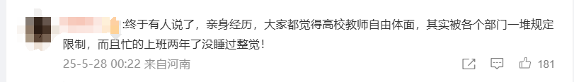 有一位疑似是高校教师的网友表示,大家都觉得高校教师自由体面,其实被各个部门一堆规定限制,而且忙得上班两年了没睡过整觉。