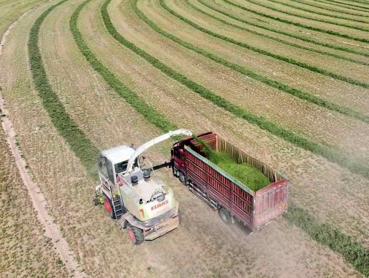 日前,甘肃省张掖市甘州区畜牧产业园内优质饲草基地里的苜蓿开始采收,大型饲草收割机、自走式粉碎机、运输车等来回穿梭,场面壮观。