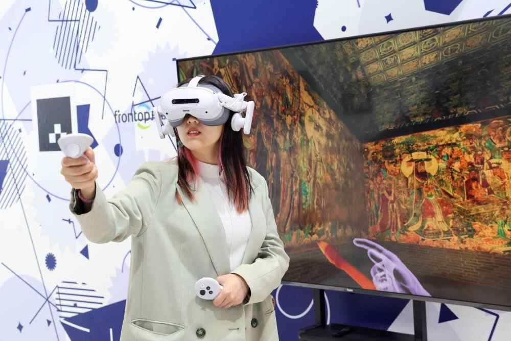 5月23日,观众在文博会现场体验VR修复永乐宫壁画。新华社记者 梁旭 摄