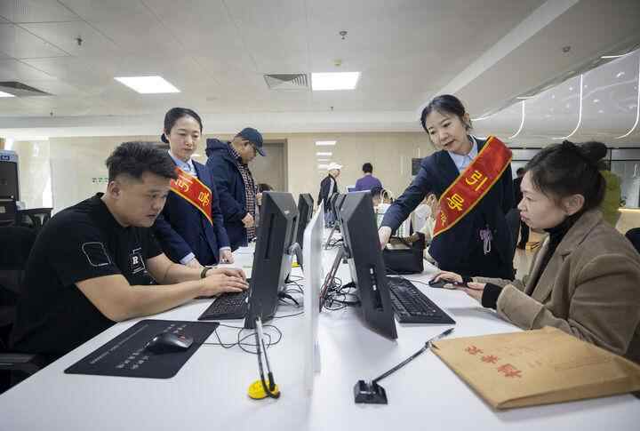 2025年3月21日,在银川市审批服务管理局企业服务大厅,工作人员引导办事人员使用“宁夏企业开办‘一网通办’服务平台”办理业务。新华社记者 杨植森 摄