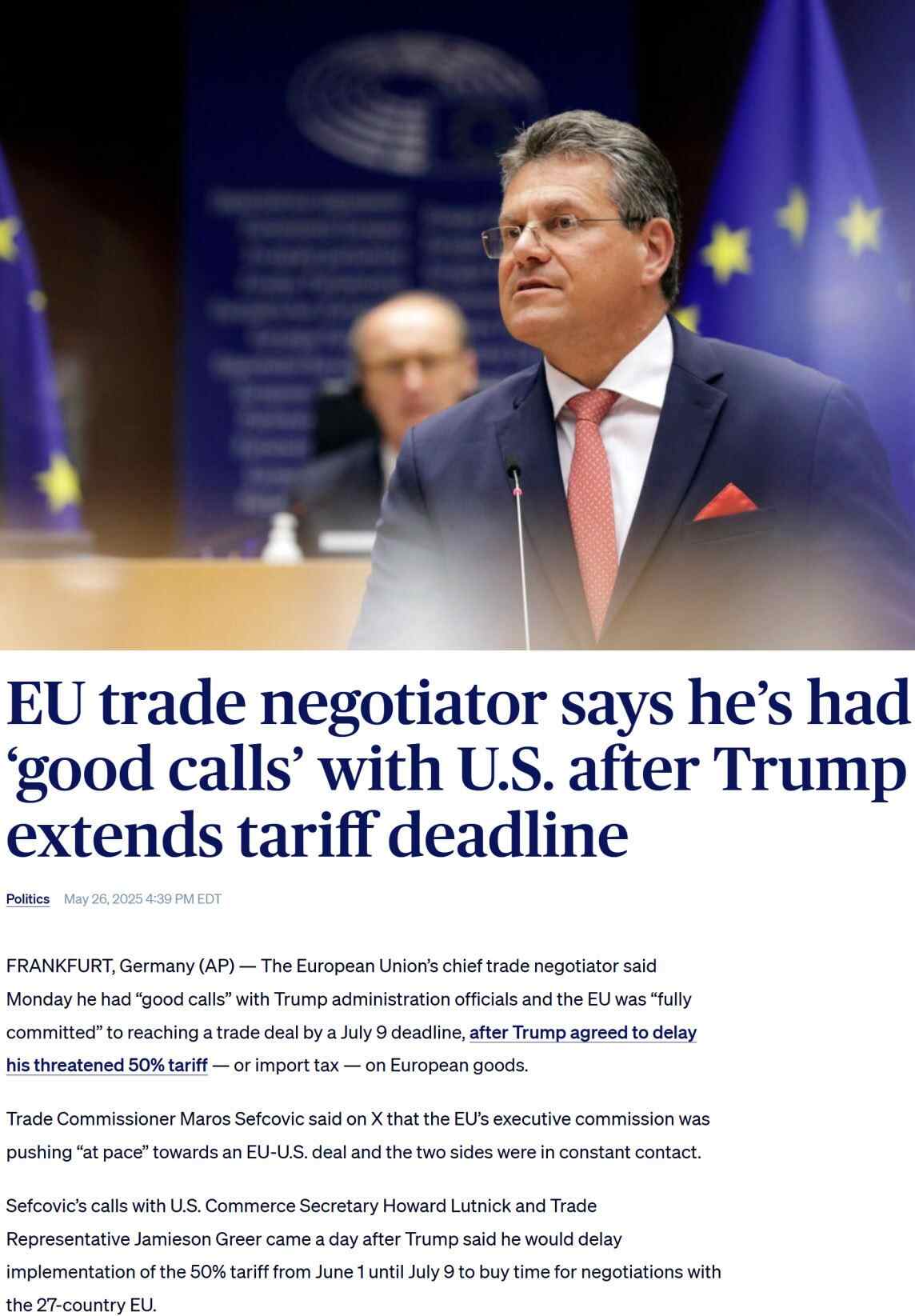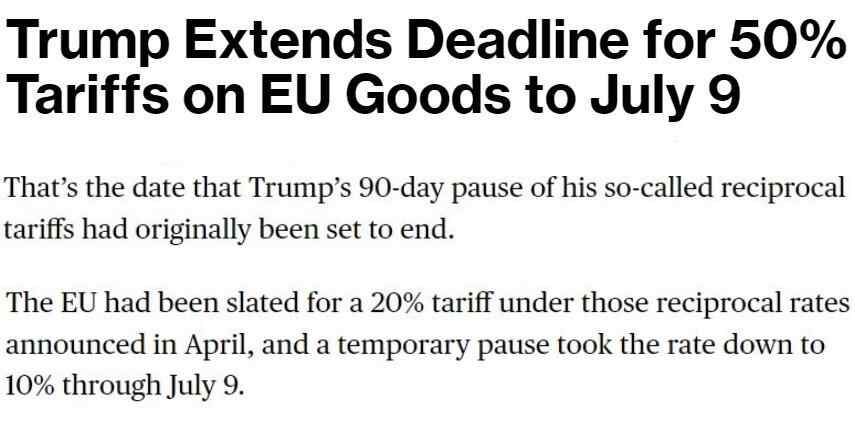 他25日告诉记者,自己当天与欧盟委员会主席冯德莱恩“愉快”地通了电话,并应对方要求,决定将原计划从6月1日开始对欧盟加征的50%的关税推迟到7月9日,以便双方有时间就此进行谈判。