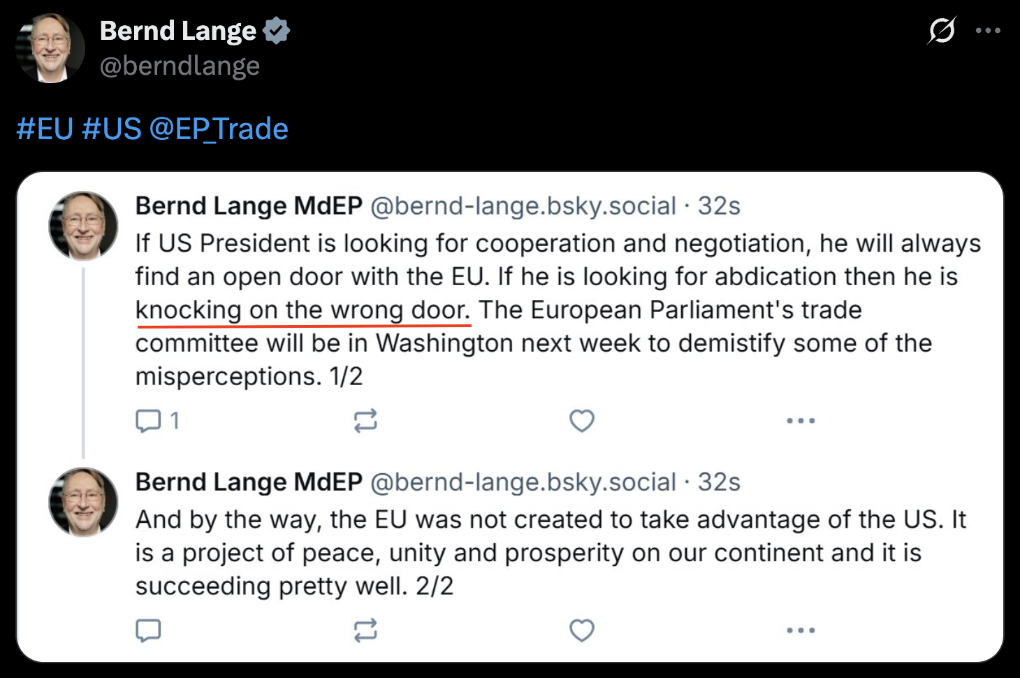 “如果美国寻求合作与谈判,欧盟总是愿意敞开大门;但如果只是想让我们照单全收美方的要求,那它就是敲错了门。”