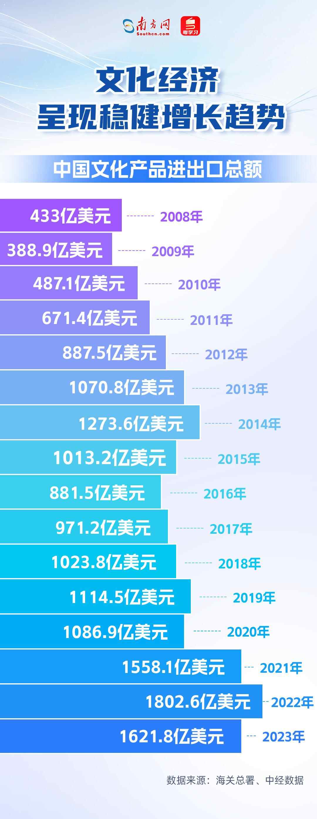 从进出口数据来看,中国文化经济呈稳健态势。海关总署数据显示,中国文化产业进出口额从2008年的433亿美元(约合3137亿元人民币)增加至2023年的1621.8亿美元(约合11750亿元人民币)。中国文化产业完成市场竞争力与话语权指数的双重爬升,形成了不可抵挡的传播力。