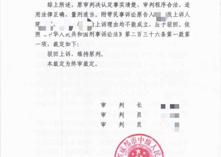 2024年11月,成都中院作出终审裁定,认定原审判决事实清楚,审判程序合法,适用法律正确,量刑适当,决定驳回上诉,维持原判。