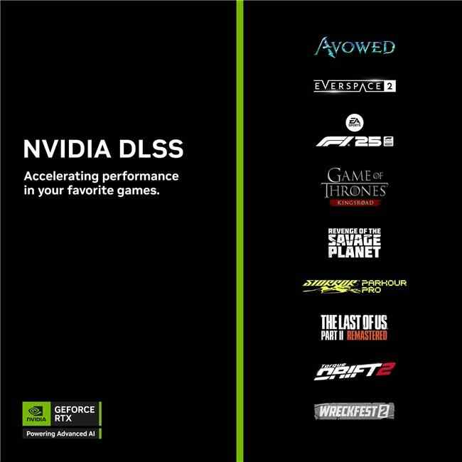本周,DLSS 4多帧生成为EA SPORTS F1® 25、《宣誓》(Avowed)、《永恒空间2》(EVERSPACE 2)、STORROR Parkour Pro、《最后生还者™ 2重制版》(The Last of Us™ Part II Remastered )、《扭矩漂移2》(Torque Drift 2)和《撞车嘉年华2》(Wreckfest 2)带来性能倍增。《权力的游戏:国王之路》( Game of Thrones: Kingsroad)和《狂野星球复仇记》(Revenge of the Savage Planet)现已支持DLSS超分辨率。