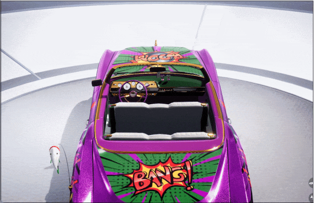 狂魇小丑和狂魅哈莉角色上各有象征对方的“玩偶挂件”,出场也有共舞的联动片段,它可以对应上二人的甜蜜期;而高人气的鬣狗背包又在提醒着“波折”的存在(影视剧中哈莉的宠物鬣狗是被小丑甩后出现);再看有着小丑标志HAHAHA闪耀贴纸的载具,里面细节亦有二人的故事,车内的哈莉形象弹簧饰品、小丑标牌背后的“mad love”(中文译为疯狂的爱)以及车头小标的“鬣狗”形象,又似乎在传递“割舍不掉的爱”。