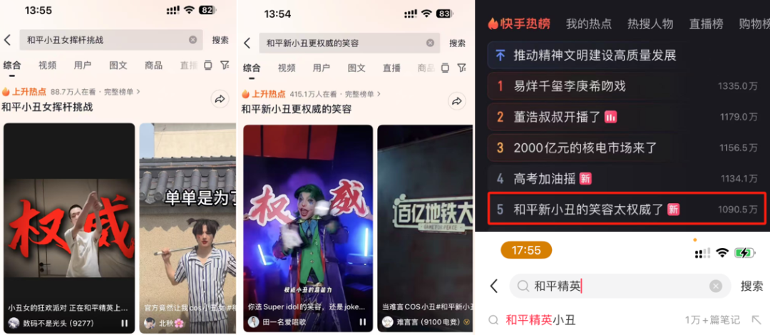 具体到热度上,在抖音和快手两大短视频平台,#和平精英联动DC小丑#、#和平新小丑更权威的笑容#、#和平小丑女挥杆挑战#等话题接连登上热榜,短短5天时间拿下了过亿的播放量,在小红书平台搜《和平精英》,跳出的前五个话题里有3个是“和平精英小丑联动”相关,且单第一个话题相关笔记数量就已经暴涨到了1万+。