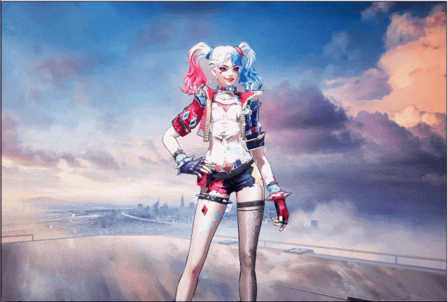 可以看到,《和平精英》中的狂魅哈莉选用了漫画风做角色的身材呈现,你甚至能看到马甲线,加上破洞的渔网袜、腹部腿部的彩绘涂鸦以及站立时的wink表情(这个表情也是哈莉·奎茵在《猛禽小队》中的出圈剧照),处处都在放大其魅力,但,手腕上一层套一层的尖刺装饰又在传递着“不好惹”的信号。