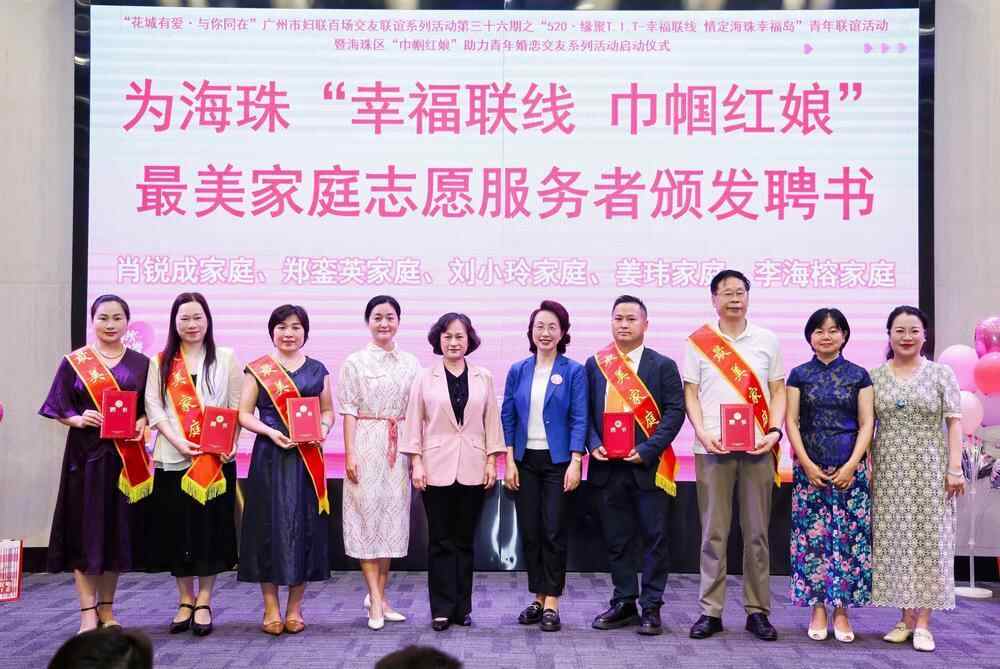 活动还正式成立了海珠区“幸福联线 巾帼红娘”志愿服务队。这是一支由妇联组织牵头组建的爱心队伍,汇聚了海珠区最美家庭代表等来自社会各界的热心人士,她们将发挥最美家庭的榜样作用,积极参与联谊活动志愿服务,积极倡导向善向上的婚恋观和家庭观,鼓励青年们勇敢追求幸福,用心经营生活,帮助更多青年收获美好爱情与幸福婚姻,推动新时代家庭家教家风建设。