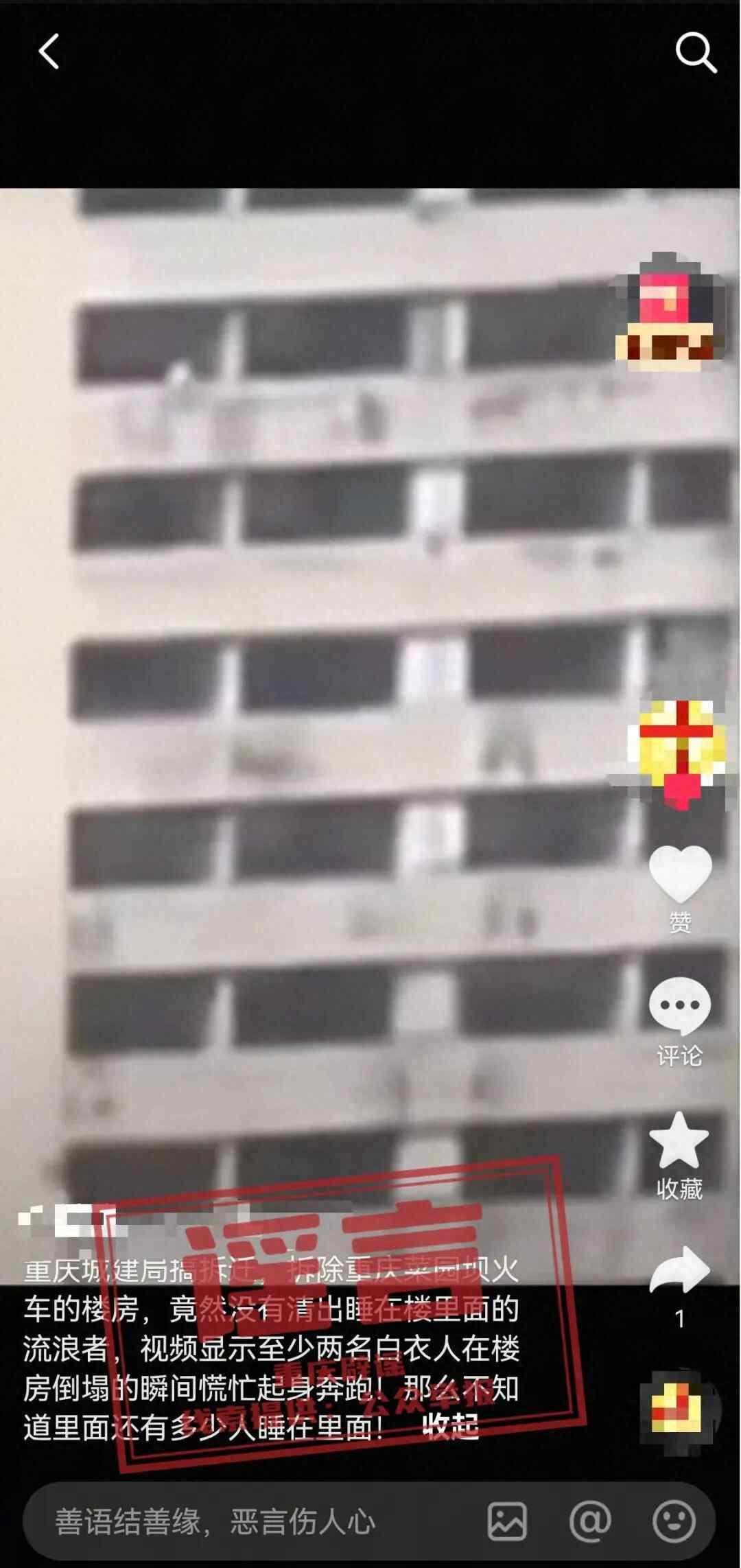 近日,有网民在互联网平台发布信息称“拆除重庆菜园坝火车的楼房,竟然没有清出睡在楼里面的流浪者,视频显示至少两名白衣人在楼房倒塌的瞬间慌忙起身奔跑!”,引发关注。经核实,网传信息系谣言。