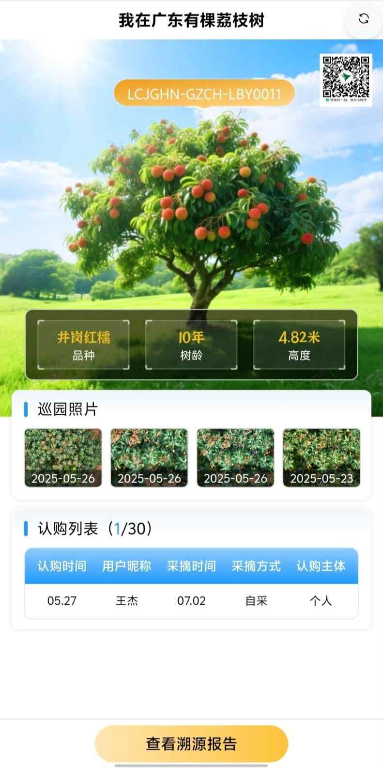 据介绍,在挂上签有名字的专属“身份证”后,用户即可通过扫码查看果园环境、生长档案等详细信息,还能每日接收果树专属成长影像,直观见证荔枝由青转红的成熟过程,也可选择亲自来果园采摘。