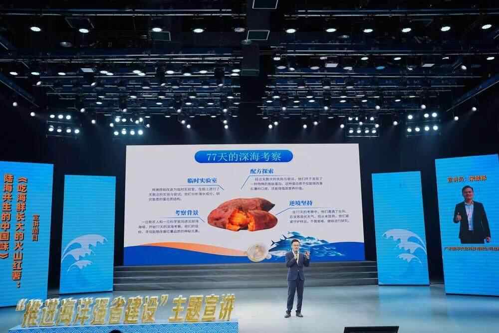 “您闻到的,哪里只是红薯的甜香?”宣讲现场,广东佳淳农业科技有限公司总经理宋景标带来了“吃海鲜”长大的火山红薯。“红土黏度大,种红薯肯定血本无归。”面对劝阻的声音,宋景标和省科学院南繁种业研究所湛江研究中心主任罗青文联手,通过科研与产业紧密协作,选育不“循规蹈矩”的品种,再从上百次的出海试验中找到鱼肽蛋白,让深海养分加持火山红薯的口感。