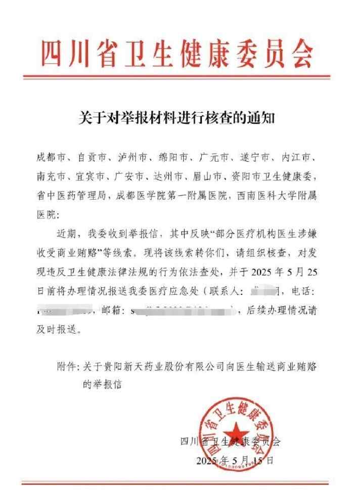 《通知》显示,四川省卫健委近期收到举报信,其中反映了“部分医疗机构医生涉嫌收受商业贿赂”等线索,涉及30余家医疗机构的超百名医生。文件还称,四川省卫健委要求成都市、资阳市等多地卫生健康委,以及省中医药管理局等多家单位组织核查,对发现违规的行为依法查处。