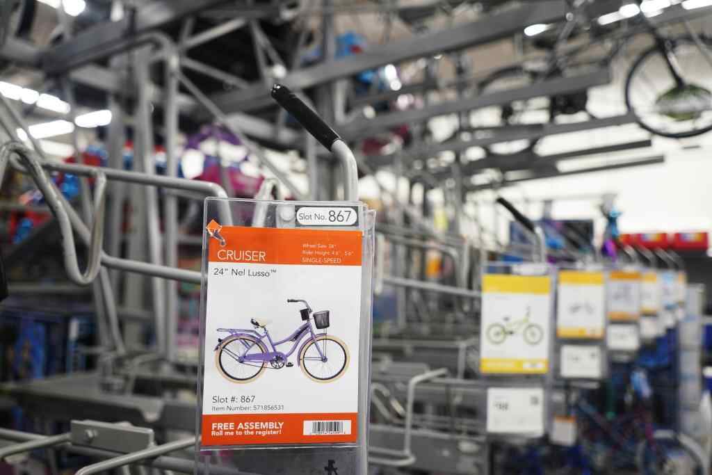 这是5月21日在美国加利福尼亚州旧金山湾区圣莱安德罗一家沃尔玛超市拍摄的自行车货架。新华社记者 吴晓凌 摄