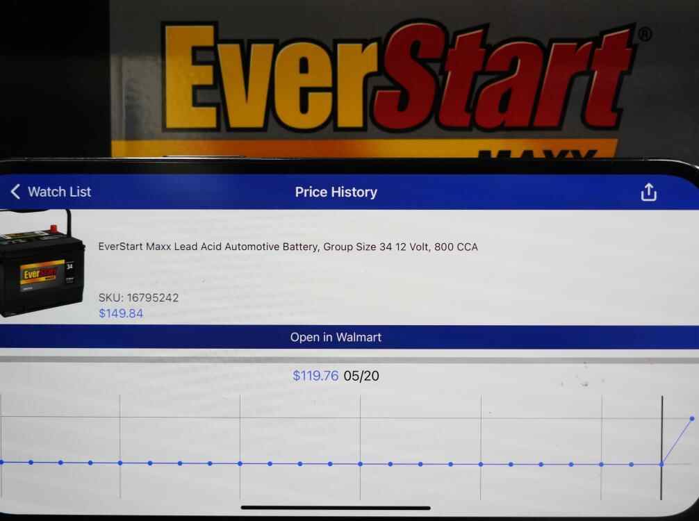 5月21日,在美国旧金山湾区圣利安卓San Leandro的一家沃尔玛超市,价格跟踪软件(Walmart Tracker)显示商品(EverStart汽车蓄电池)售价变化。新华社记者吴晓凌摄