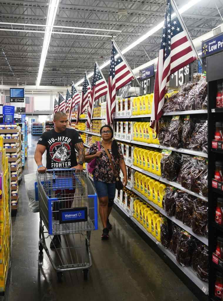 5月20日,顾客在美国加利福尼亚州洛杉矶县一家沃尔玛商店内采购商品。新华社发(邱晨摄)