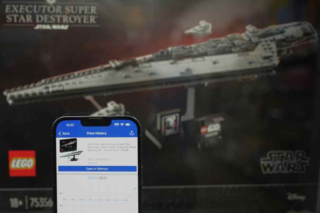 5月21日,在美国加利福尼亚州旧金山湾区圣莱安德罗的一家沃尔玛超市,价格跟踪软件显示一款星球大战主题的乐高玩具售价变化情况。新华社记者 吴晓凌 摄