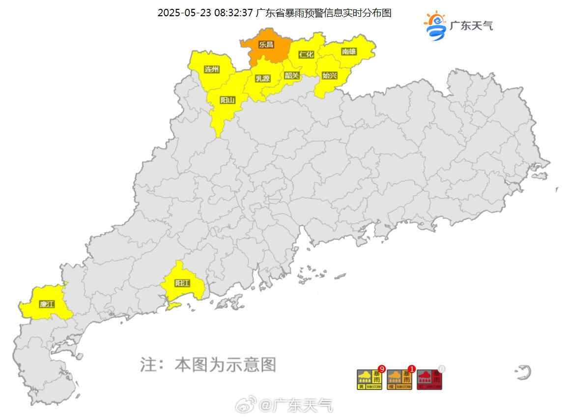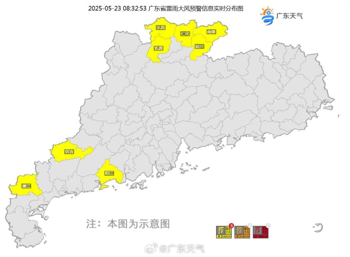 截至8时32分,乐昌暴雨橙色预警生效,廉江、阳江、南雄等9个市县暴雨黄色预警生效中,始兴、信宜、阳江等8个市县发布雷雨大风黄色预警。
