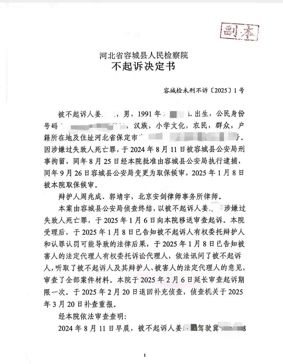 记者看到,《不起诉决定书》上显示,被不起诉人姜某,1991年出生,因涉嫌过失致人死亡罪,于2024年8月11日被容城县公安局刑事拘留,同年8月25日经该院批准由容城县公安局执行逮捕,同年9月26日容城县公安局变更为取保候审,2025年1月8日被该院取保候审。