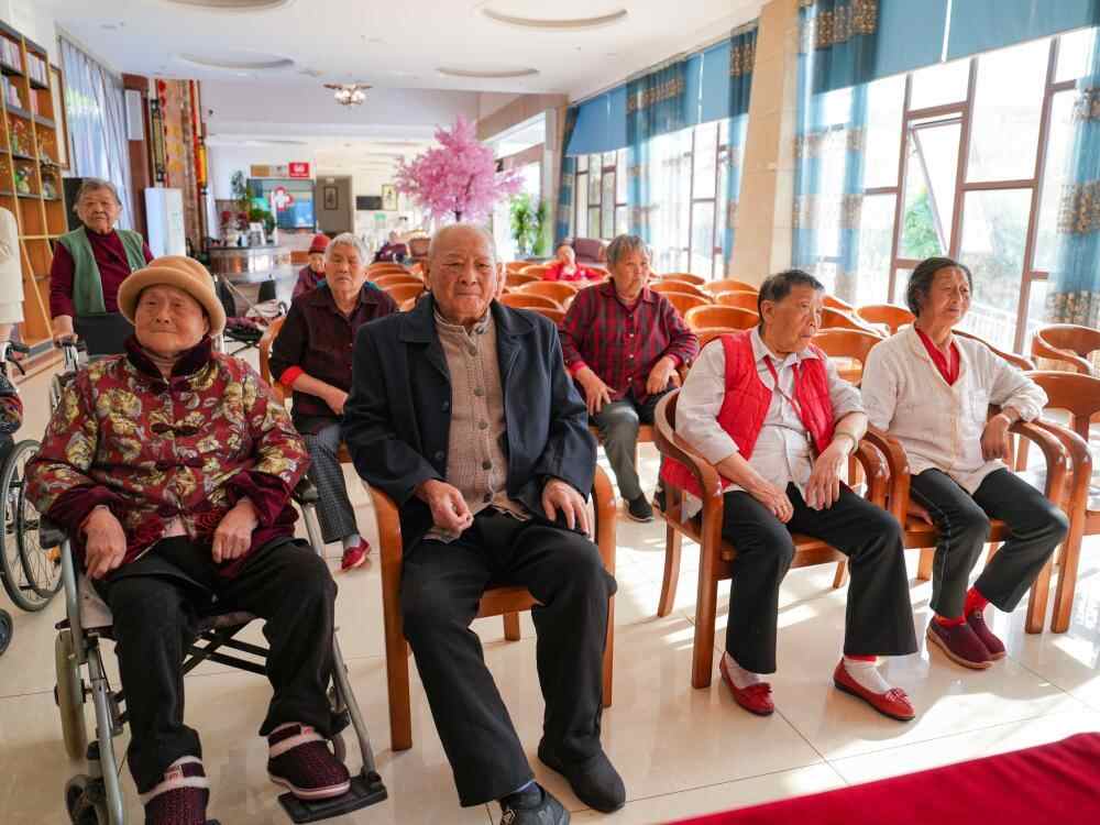 ↑在四川省南充市五福堂颐养院,刘寿山(前排左二)与老人们一起看电视(4月9日摄)。