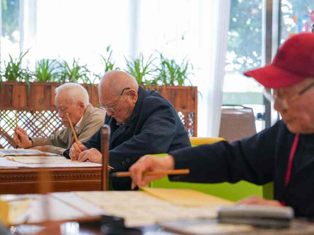 ↑刘寿山(中)在四川省南充市五福堂颐养院练习书法(4月9日摄)。