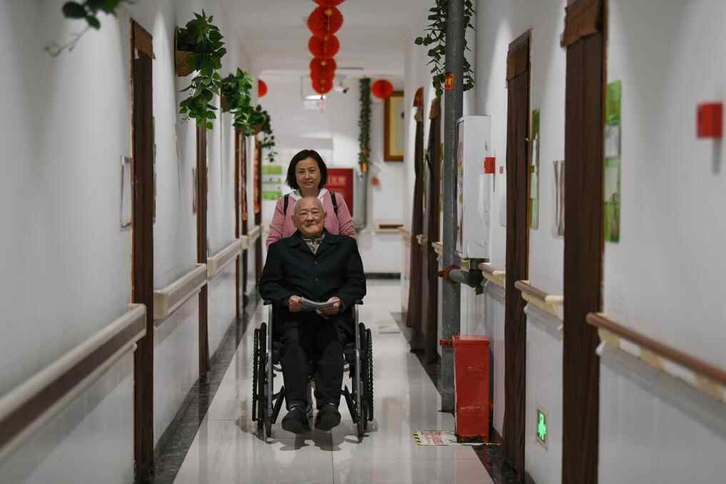 ↑刘寿山在四川省南充市五福堂颐养院散步(4月9日摄)。
