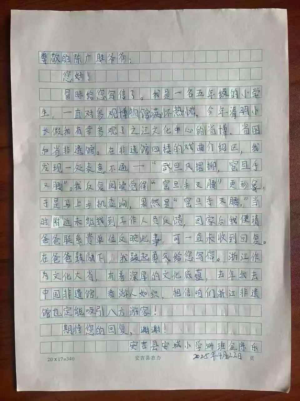 4月26日,陈广胜手写了回信,感谢金陈乐指出错误,告诉他已经更正,“在这一刻,你事实上成了我们的‘小老师’……欢迎你和爸爸再来省非遗馆作客。”