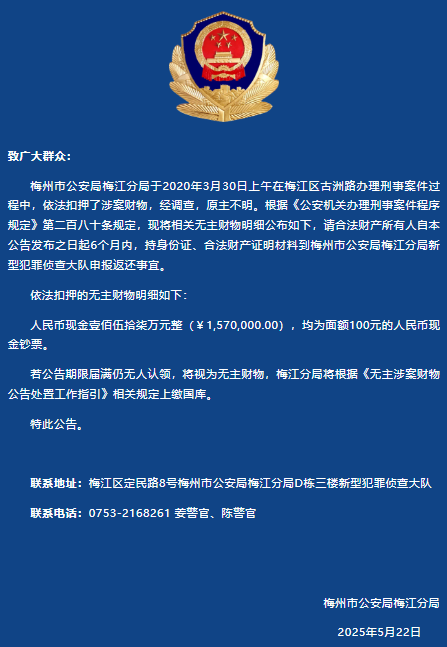 5月22日,广东梅州市公安局梅江分局发布公告称,该局于2020年3月30日上午在梅江区古洲路办理刑事案件过程中,依法扣押了涉案财物,经调查,原主不明。根据《公安机关办理刑事案件程序规定》第二百八十条规定,现将相关无主财物明细公布如下,请合法财产所有人自本公告发布之日起6个月内,持身份证、合法财产证明材料到梅州市公安局梅江分局新型犯罪侦查大队申报返还事宜。