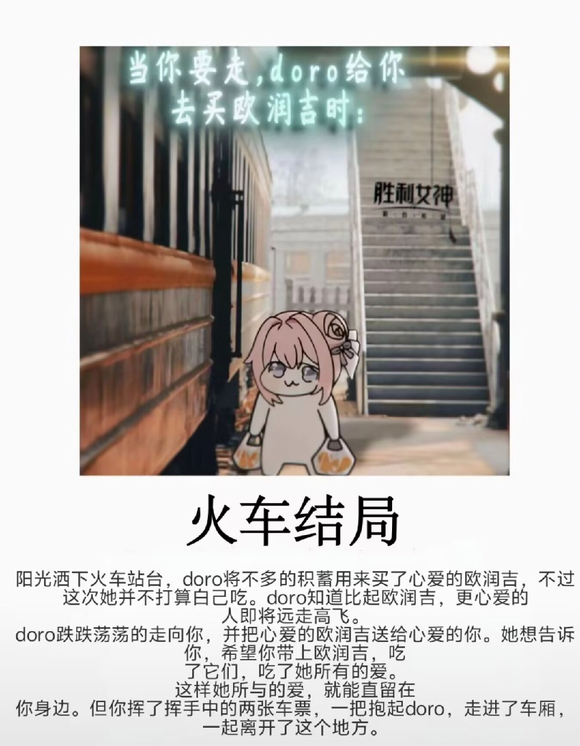 再比如最近已经发展成为热门互联网迷因的Doro,这个“粉毛人头狗”的原型正是《胜利女神》角色桃乐丝的二创作品。更重要的是,在互联网Meme不可避免走向抽象的大背景下,玩家社群对Doro的再创作反而走了温情向/虐心向的情感路线,像出圈到doro这个程度的meme,可以说是已经名流“二次元史”的程度了。