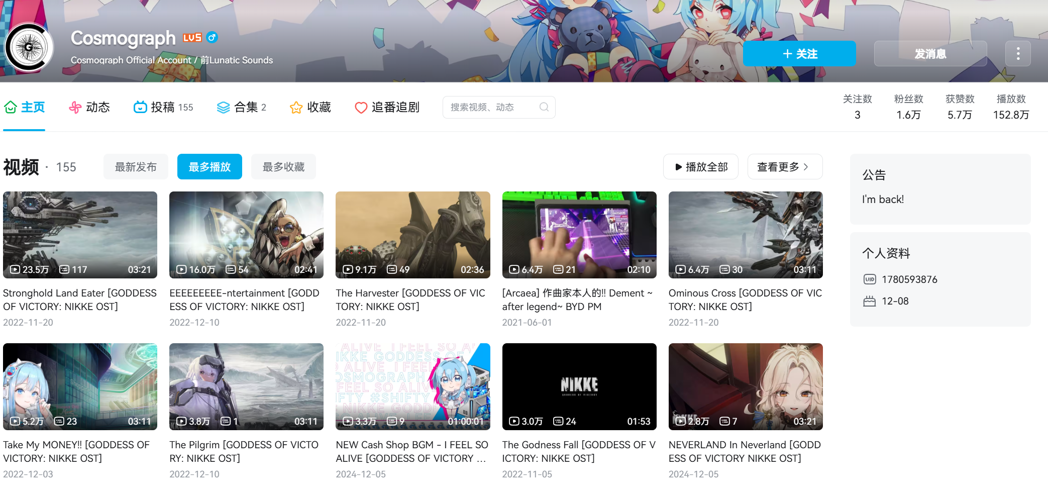 最后,有必要提一嘴国服的音乐。接下来我们将要请出的是,被玩家爱称为“C神”的Cosmograph。他为《胜利女神》系列提供的每一首音乐几乎都是好评如潮。各位读者不妨去B站的Cosmograph鉴赏一下。