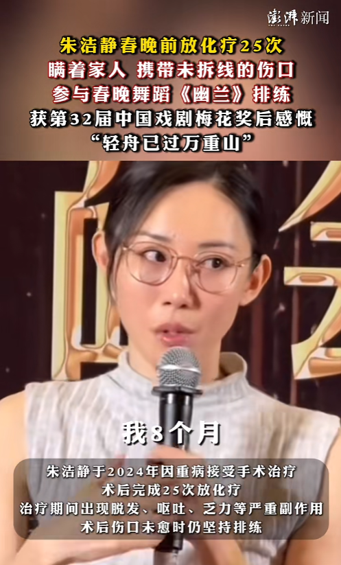 据悉,朱洁静于2024年因重病接受手术,术后经历长达八个月的康复期,随后,朱洁静重返舞台。她在春晚前放化疗25次,治疗期间出现脱发、呕吐、乏力等严重副作用,但她还是瞒着家人,携带未拆线的伤口,参与春晚舞蹈《幽兰》排练。