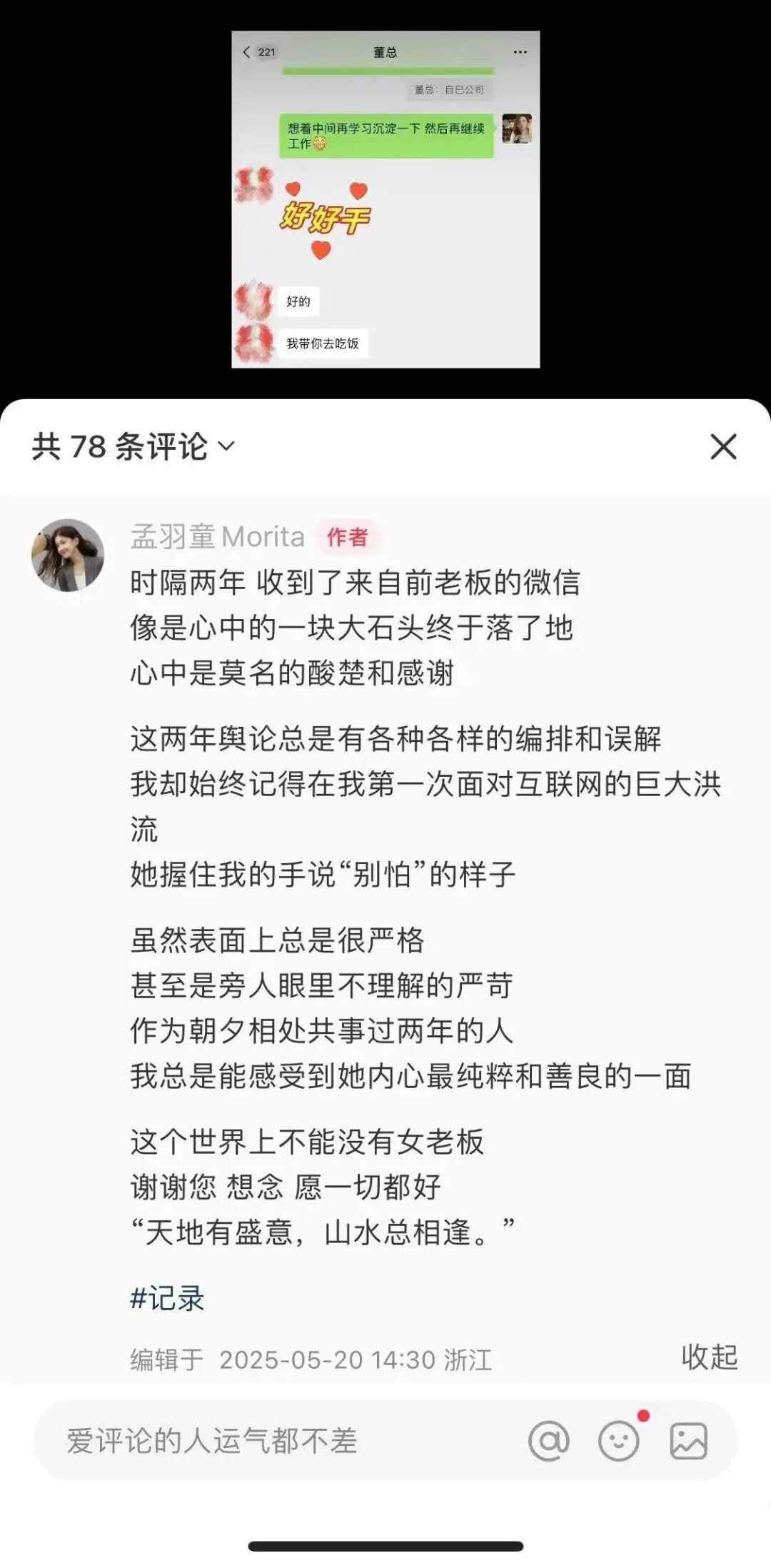 5月初,孟羽童曾回应与董明珠“互撕”,称根本不存在,“前司和前老板一直是我人生里闪亮的旅程和重要的贵人。”