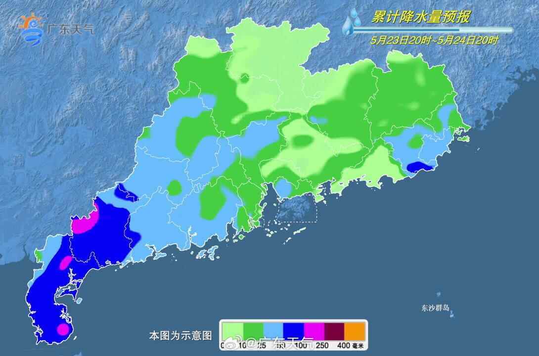 ◆预计,24日,珠江口以西市县有中到大雨,其中湛江、茂名市县局地有大暴雨,并伴有8级局地10级雷雨大风,中北部市县最高气温介于23-27℃之间;25-26日,广东省大部云量较多,有分散(雷)阵雨,局部大雨或暴雨。