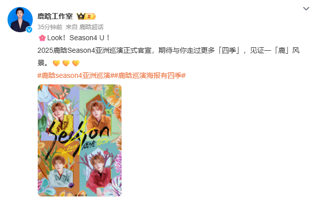 5月23日晚,鹿晗工作室正式官宣“2025鹿晗Season4亚洲巡演”,期待与你走过更多「四季」,见证一「鹿」风景。
