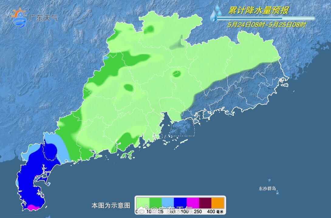 @广东天气 预计24日,珠江口以西市县有中到大雨,其中湛江、茂名市县局地有大暴雨,并伴有8级局地10级雷雨大风,中北部市县最高气温介于23-27℃之间;25-26日,广东省大部云量较多,有分散(雷)阵雨,局部大雨或暴雨。