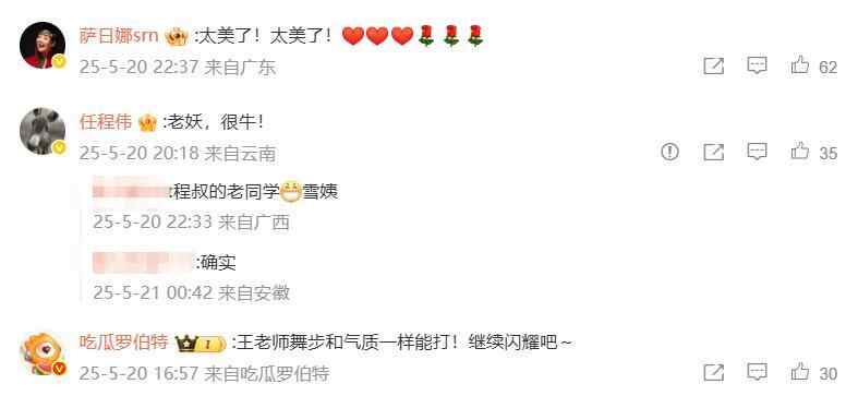 在评论区,曾出演过《闯关东》《人世间》的演员萨日娜称:太美了!太美了!“雪姨”的上海戏剧学院同学、《战长沙》中的“姐夫”任程伟也留言:老妖,很牛!