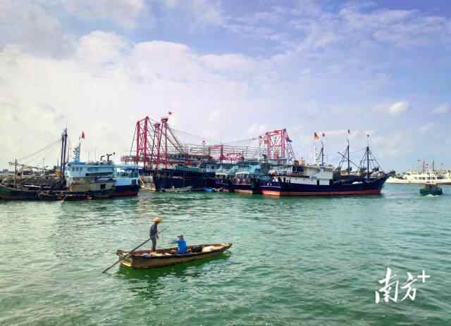 广东湛江霞山渔港丽日晴空,渔船停泊休整。