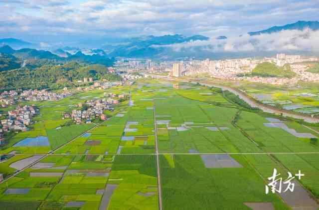 广东清远连州市连州镇龙口村,晨光下的农田呈现出绿美的田园画卷。