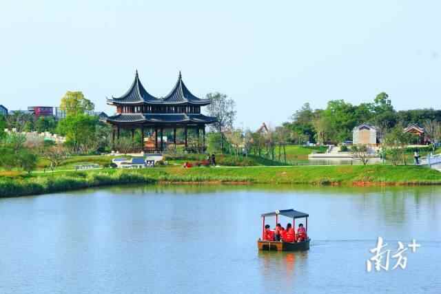 广东珠海中山公园,水清草绿,游客乘船赏景,如在画中游。