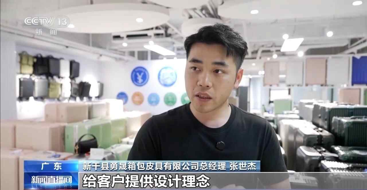 新干县勇晟箱包皮具有限公司总经理 张世杰:现在海外很多国外的客户找到我们,我们给客户提供设计稿,给客户提供设计理念,在轻工业这个领域来讲我们可以说是无敌。
