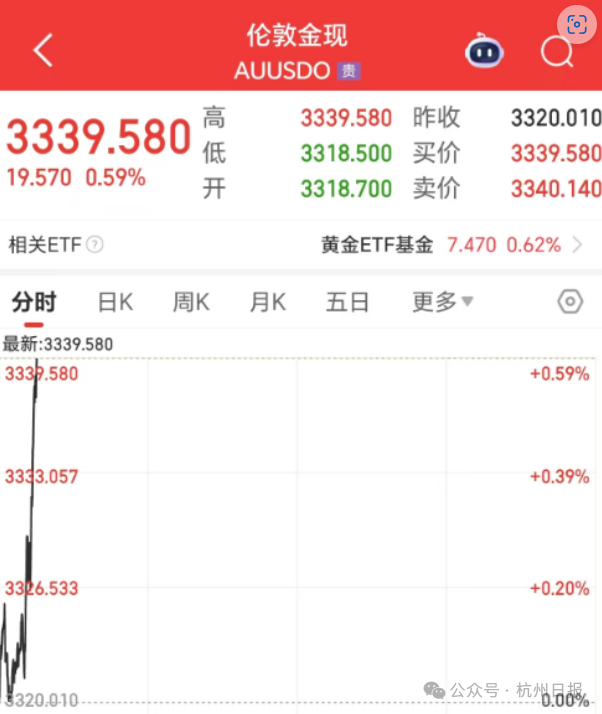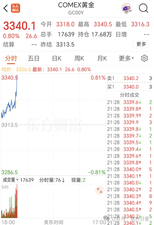 5月22日,现货黄金盘中再次出现急拉。刚刚,COMEX黄金一度冲破3340美元,涨幅超0.8%。