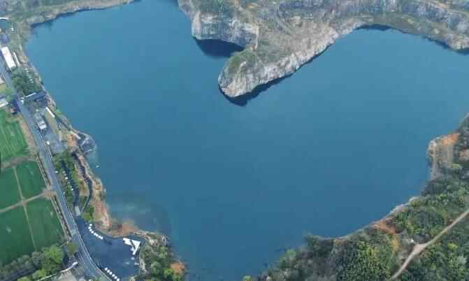 程铄钦【“深蓝计划”主理人】:在2005年之前,安吉这边主要还是开矿。“两山”理念提出后,安吉就开始陆续关停矿坑。我们这个矿坑大概是在2012年开始关停,就一直就废弃着。它最深的地方有108米,整个面积大概有360多亩,其中水域面积有280多亩。从高空无人机俯瞰的时候,它像一个爱心的形状。几年前,我们刚来的时候,它还是蛮糟糕的一个状态,虽然有保护网的隔离,但还是会有很多人翻过来拍照,会有一些生活垃圾的倾倒。当时小伙伴们在想,我们用什么样的方式把这个地方打开。