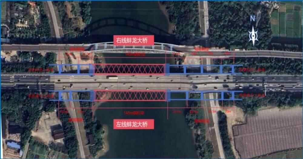 蚌龙大桥是北二环改扩建项目的“咽喉”工程,也是TJ7标3.4千米主线范围内的关键性控制工程。桥梁全长335米,横跨流溪河。桥梁采用分离式拼宽,主跨为国内跨度第二大的145米钢桁梁,采用纵、横向二次整体顶推进行施工,主墩为3.5米超大直径圆柱墩,盖梁为大体积异形结构盖梁,具有重量大,结构线型控制难的特点。同时左、右幅拼宽桥梁距现行北二环高速公路极近,靠旧桥侧施工作业空间狭小,整体施工难度较大。