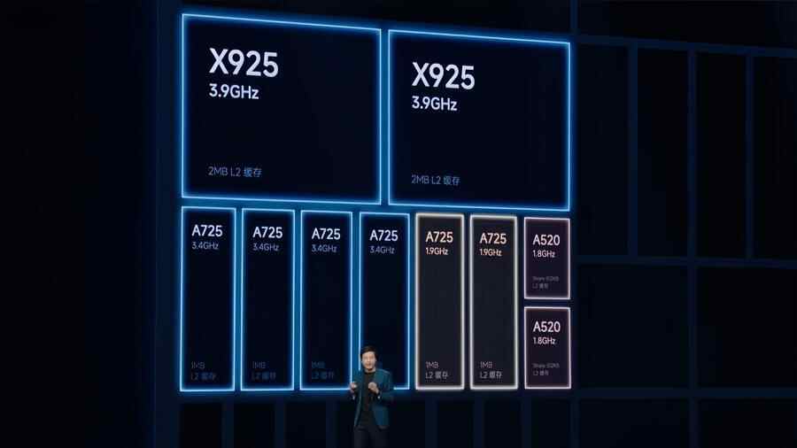 雷军介绍,双超大核的设计由苹果率先尝试,性能和体验都非常好。此次小米新发布的“玄戒O1”芯片双超大核用了Arm最新一代的X925——与上一代相比增加了36%的性能,并且整个双超大核的主频做到了惊人的3.9GHz。