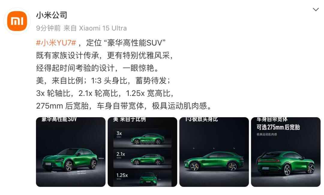 5月22日,小米集团董事长雷军在小米15周年战略新品发布会上宣布,小米YU7正式发布。车长近5米,宽2米,高1.6米 ,275mm 后宽胎,车身自带宽体,定位 “豪华高性能SUV”。